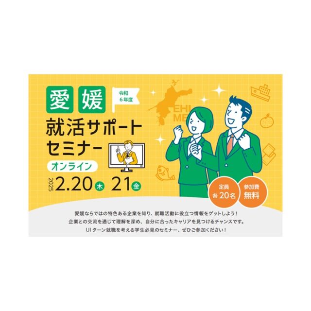 オンライン開催!2月20日・21日 愛媛就活サポートセミナー開催! 愛媛県での就職を考えている学生の方へ! 愛媛県内の企業で ・海外でも活躍している企業 ・海外でどんな活動をしているんだろう? ・愛媛県内企業の働き方とは […]