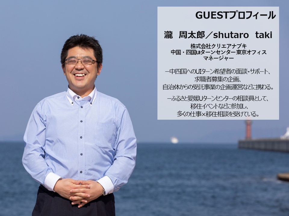 このセミナーでは、職業紹介のプロである、ふるさと愛媛Uターンセンターお仕事相談窓口の瀧周太郎氏をゲストに“愛媛のお仕事事情”についてお話します。