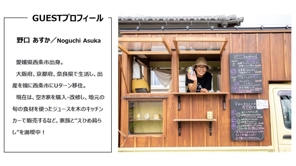 関西圏からUターン移住した野口あすか氏をゲストに、「なぜ愛媛へUターンしたのか」「愛媛での生活や暮らし方」などについてトークします。