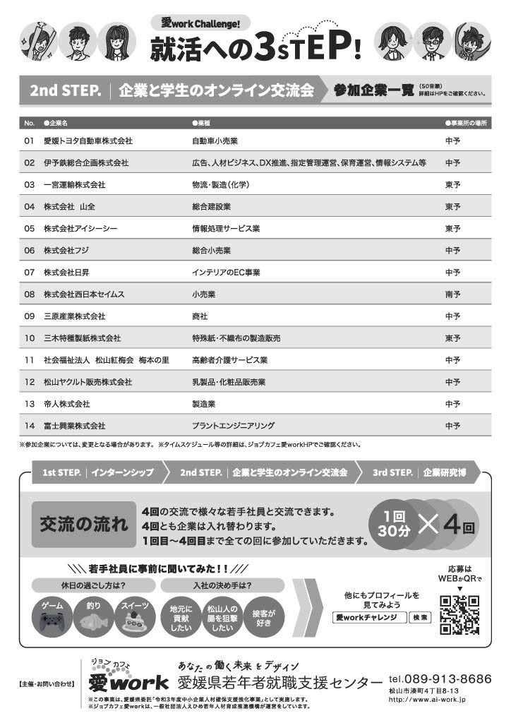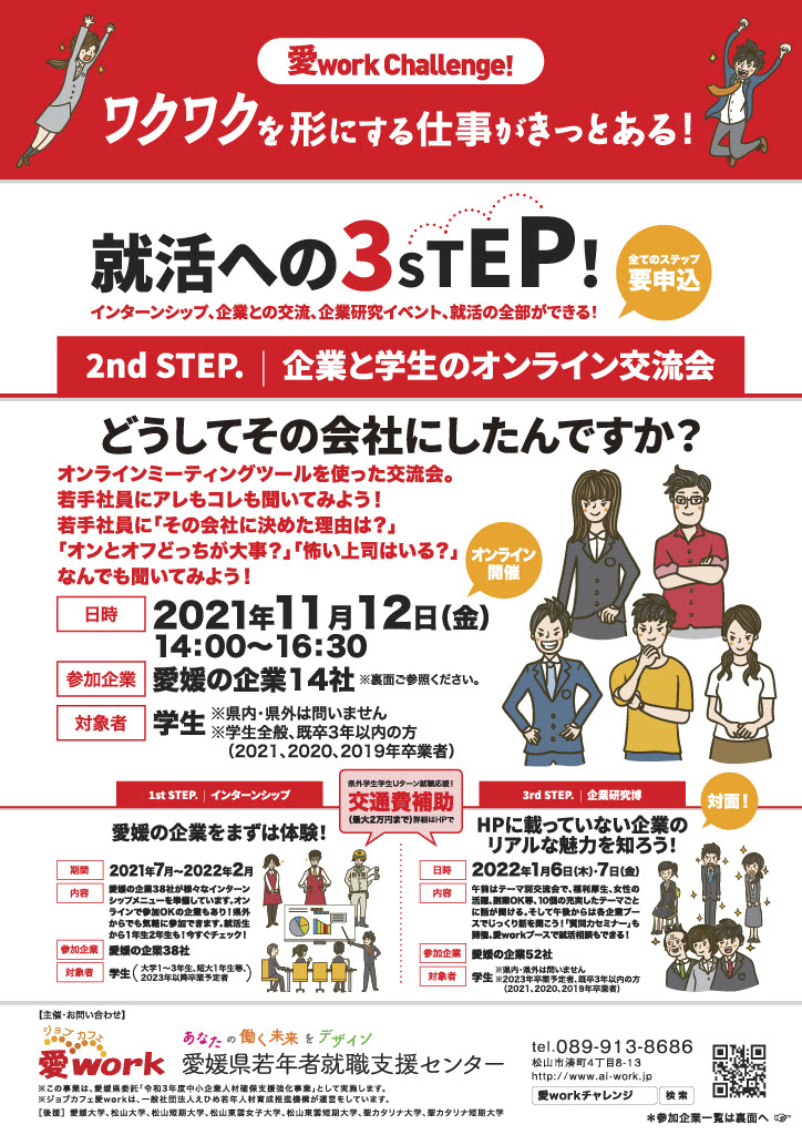 愛媛で就職を考えている学生のみなさんには、絶対に外せないイベント「愛work Challenge!」。インターンシップから、企業との交流会、企業研究イベントまで自分の未来(キャリア)をつくるために必要なイベントを揃えました。