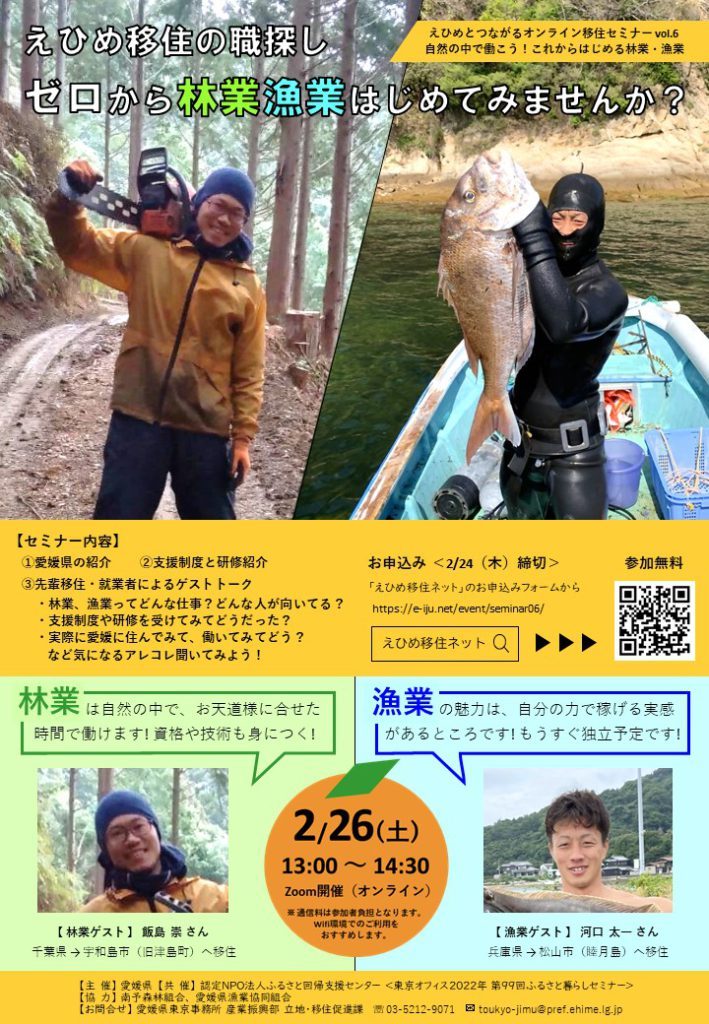 研修や資格取得、OJTでしっかりと勉強できる「林業」と、独立型・雇用型の選べる研修あり、ご自身の力を試せる「漁業」。それぞれ移住して就業された方をゲストに迎えて、リアルな仕事と生活を紹介するセミナーが開催されます!当日は、チャットによる質問も大募集!マイクはミュート、ビデオはOFFで服装を気にする必要はありません。