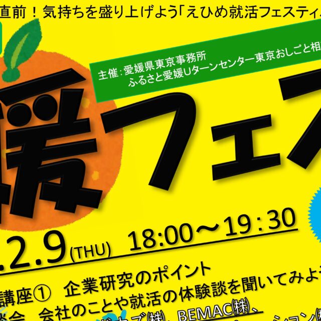 就職を機に愛媛に帰りたい、行ってみたいと考えている学生のみなさん!「えひめ就活フェスティバル」をオンラインで開催します!!企業研究のポイント、エントリーシートの書き方や県内企業のことを学んでみませんか? 企 […]