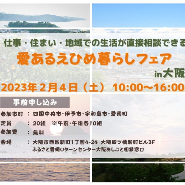 松山市主催「まつやま圏域 暮らし・仕事相談会」を東京の移住・交流情報ガーデンで開催します! まつやま圏域は、松山市・伊予市・東温市・久万高原町・松前町・砥部町の6市町からなる魅力あふれるエリアです。 当日は全6市町と創業 […]